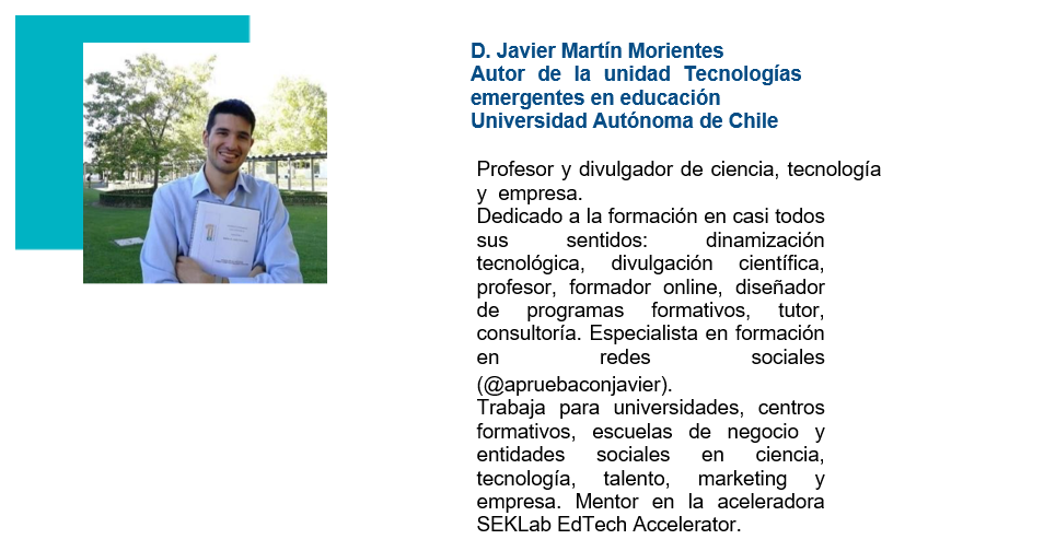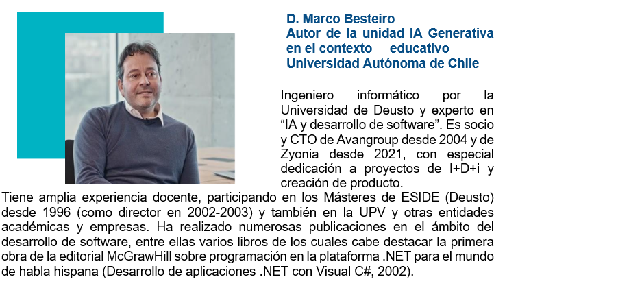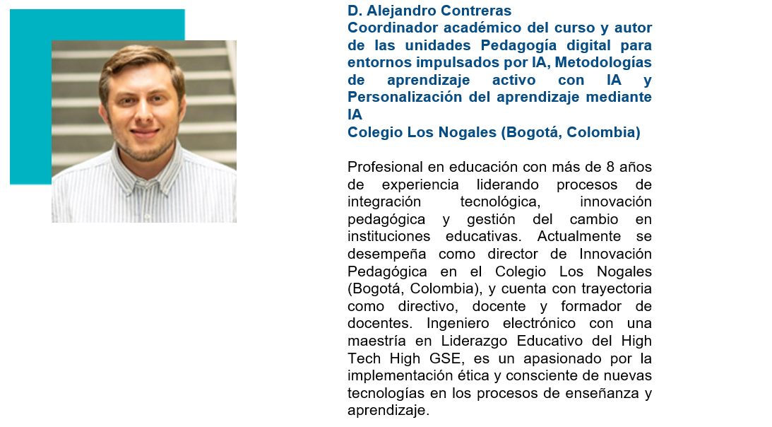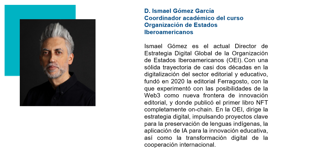 Este curso invita a educadores, de cualquier etapa y disciplina, a desarrollar una mirada crítica y creativa sobre el potencial para la educación de la IA, así como de otras tecnologías, presentes o futuras. A través de un enfoque práctico, se abordan los fundamentos de la IA y las estrategias pedagógicas de más utilidad para generar ambientes innovadores de aprendizaje, en los que la IA, pero también cualquier otra tecnología, imaginada o inimaginable en la actualidad, pueda propulsar la calidad de la educación, así como el bienestar de todos los miembros de cualquier sociedad de aprendizaje, formal o informal.